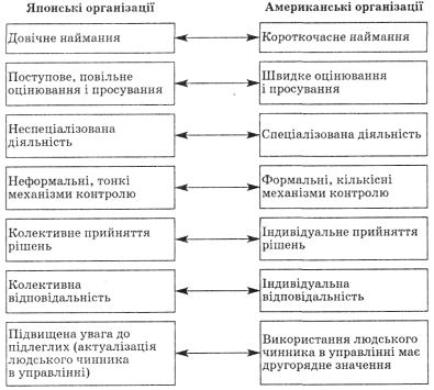 Рис. 14. Порівняльна схема японської та американської моделей організації (управління) за У. Оучі