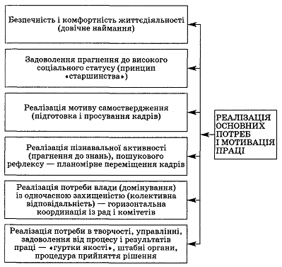 Рис. 13. Реалізація основних потреб і мотивація праці в японській структурі управління корпорацією (В. Лозниця)
