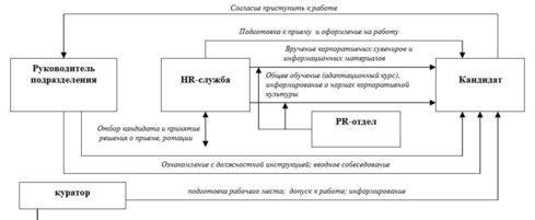 | 4 | Информирование о политике компании в отношении персонала, о нормах корпоративной культуры | HR-служба, PR-отдел, центр обучения | HR-служба, Центр обучения совместно с PR-отделом разрабатывает информационное пособие по корпоративной культуре для новых работников. Информационное пособие передается в кадровую службу, где дополняется в соответствии со спецификой подразделения |