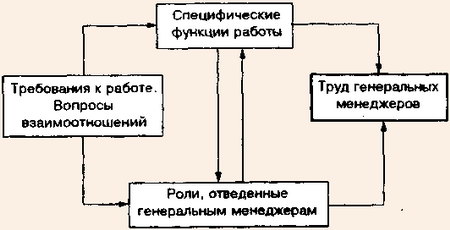 На рисунке по сути изображена модель факторов, формирующих работу генеральных менеджеров. Основными двумя элементами, влияющими на их работу, являются требования к работе и вопросы взаимоотношений внутри и вне предприятия. Они отличаются в зависимости от продолжительности исследуемого периода. Эти два элемента рождают специфичные функции работы, которые генеральные менеджеры выполняют с помощью разных своих ролей, а последние в свою очередь в действительности определяют работу генеральных менеджеров0.