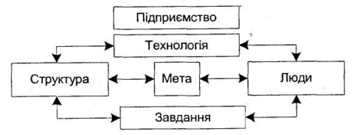 Всі внутрішні змінні фактори діють у взаємозв'язку, що дозволяє досягти цілей організації (рисунок 2). Оскільки внутрішні змінні складаються із соціального (люди) і технічного компонентів, то їх називають внутрішніми соціотехнічними підсистемами, що вимагає однакової уваги як до соціальних, так і до технічних питань організації. Віддача можлива лише в їх взаємодії.