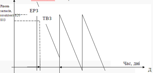Висновок: Замовлення необхідно призводити тоді, коли об’єм замовлень зменшиться до 803 комплектів. Враховуючи те, що у день реалізується 73 компл., то замовлення необхідно робити у день його отримання. Нове замовлення надійде через 11 днів, коли замовлення буде реалізовано.