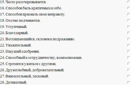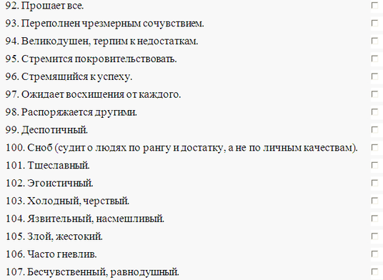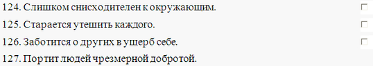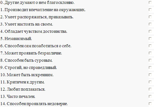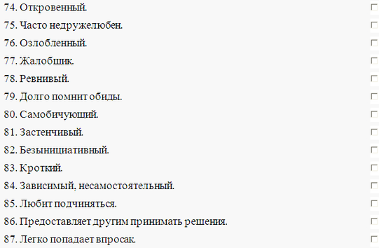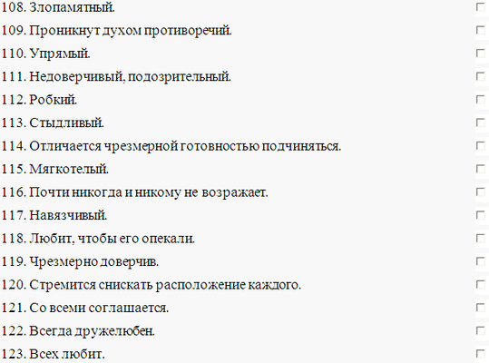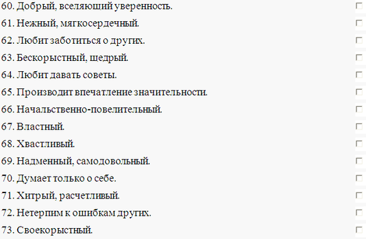 Я сперва оценила себя, свое актуальное "Я" из 128 лаконичных эпитетов (Таблица 1). Каждая из эпитетов-характеристик имеет порядковый номер. Ниже размещены характеристики с фиксацией ответа "да" либо "нет" в checkbox'е справа (отмеченный птичкой пункт означает "да").