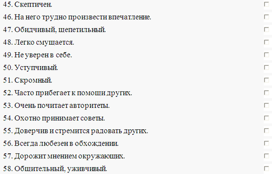 | V | 2 | 0-8. Скромный, робкий, уступчивый, эмоционально сдержанный, способный подчиняться, не имеет собственного мнения, послушно и честно выполняет свои обязанности. |