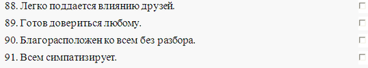 | VI | 5 | 0-8. Конформный, мягкий, ожидает помощи и советов, доверчивый, склонный к восхищению окружающими, вежливый, нуждается в признании. |