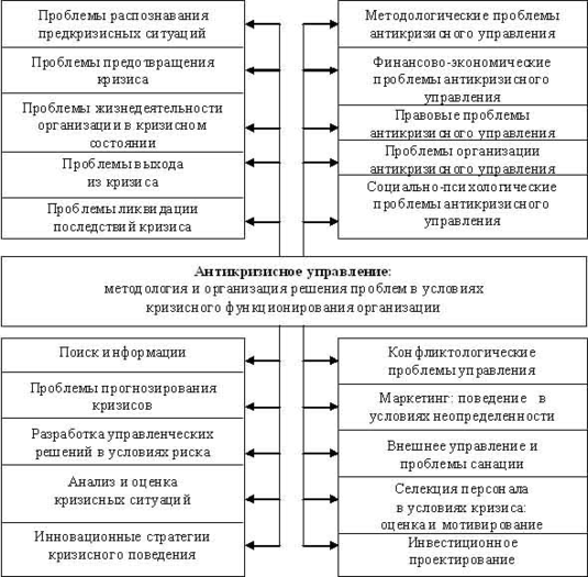 Нельзя упускать из структуры антикризисного управления и проблемы инвестирования антикризисных мер, маркетинга, а также проблемы банкротства и санации предприятий.