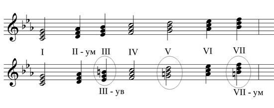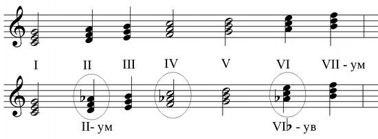 Овалом обозначены те ступени, на которых строится два варианта аккордов (в натуральном и гармоническом ладу), аккорды остальных ступеней дублируются.