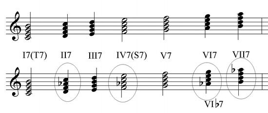 Поскольку видов трезвучий всего четыре, а видов септим три (большая, малая и уменьшенная), то септаккордов можно построить 12. Из них самых употребимых всего 5: