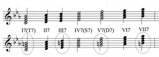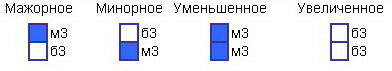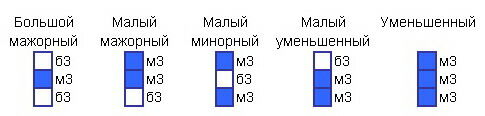 Правило побочных ступеней (II, III, VI, VII): трезвучия побочных ступеней не соответствуют основному ладу, то есть в мажоре они будут - минорные (+ одно уменьшенное), а в миноре - мажорные (+ одно уменьшенное).