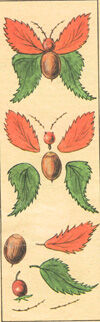Уложив листья в виде крыльев бабочки, их плотно сжимают у основания и присоединяют к туловищу, для чего на боковые края желудя (места соединения крыльев с туловищем) накладывают тонкий слой пластилина или клея. Головку бабочки делают из свежей ягоды шиповника. В нее вставляют усики из веток или проволочки и соединяют с туловищем.