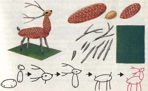 Для головы оленя берут желудь, делают в нем шилом три отверстия: два сверху, в них вставляют разветвленные веточки - это рога, и одно снизу, в которое вставляют спичку, заостренную с обоих концов для соединения головы с шеей. Затем выбирают две еловые шишки: одну большую для туловища, другую меньшего размера и короче для шеи. Сделав в них шилом по отверстию, вставляют в Отверстие большой шишки спичку, на нее плотно насаживают маленькую шишку, соединяя таким образом туловище с шеей. После этого в шишке-туловище делают еще пять таких же отверстий - четыре для ног и одно для хвоста - и вставляют в них спички. В верхней части шишки-шеи также делают одно отверстие и соединяют спичкой с головой оленя. Мордочку можно нарисовать красками или цветными карандашами.