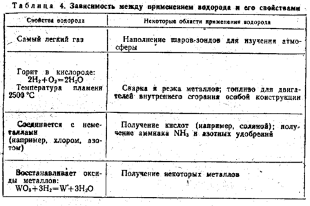 Объясняя применение водорода, учитель должен показать, как связано оно со свойствами простого вещества и его соединений. При этом важно подчеркнуть ценность водорода как химического сырья и как перспективного элемента для энергетики будущего. Водород—экологически чистое топливо, так как, сгорая, он образует воду— вещество, не чуждое природе (табл. 4).