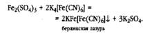 Выполнение опыта. В пробирку с 3 мл раствора гидросульфита натрия постепенно добавляют бесцветный раствор сульфата железа(И) до появления желтовато-коричневой окраски, характерной для растворов солей железа. С целью подтверждения образования сульфата железа(Ш) к полученному раствору добавляют несколько капель раствора гексацианоферрата калия. Выпадает в осадок малорастворимая соль синего цвета – берлинская лазурь.