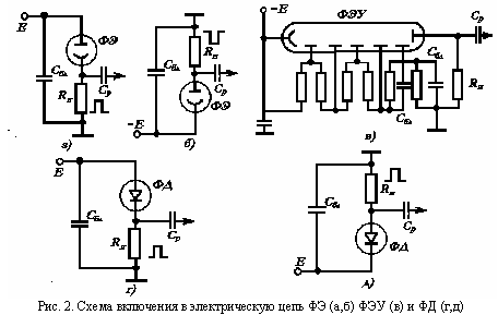 При использовании фотоприемников в качестве измерительных преобразователей в СИ энергетических параметров лазерного излучения важным моментом является согласование ФП с электронной схемой преобразования электрического сигнала измерительной информации. Обычные схемы включения ФП представлены на рис. 2. Фотоэлементы включаются в схему аналогично фотодиодам. Обычно ФП включают последовательно с нагрузкой Rн и источником питания Е. В зависимости от подключения «земляной» точки и сопротивления нагрузки сигнал ФП может быть получен как положительной (рис. 2,а,д), так и отрицательной (рис. 2,б, г) полярности. ФР включают в электрическую цепь так же, как н ФД. Для получения сигнала положительной полярности с ФЭУ можно подключить нагрузку в разрыв между одним из последних динодов и точкой подключения делителя к этому диноду. В этом случае чувствительность ФЭУ несколько ниже, чем при обычном включении, так как отсутствует усиление в последних каскадах.