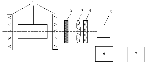 1- лазер; 2- светофильтр; 3- положительная линза; 4- матовое стекло; 5-фотоприемник; 6-усилитель; 7-осцилограф.