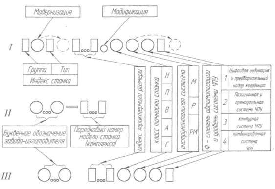 Обозначение станка с ЧПУ, например, модели ИР320ПМФ4 расшифровывается по третьему варианту (рис. 1, III): ИР — буквенное обозначение завода-изготовителя (Ивановский завод тяжелого станкостроения); 320 — характерный размер (габариты стола 320x320); П — повышенного класса точности; М — с инструментальным магазином и АСИ; Ф4 — с комбинированной системой ЧПУ.