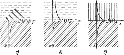 Рис. 3 - Волны на границе двух сред: а - затухающая рэлеевского типа на границе твердое тело - жидкость, б - слабозатухающая на той же границе, в - волна Стоунли на границе двух твердых тел