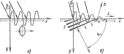 Рис. 2 - Схематическое изображение волн на свободной поверхности твердого тела: а - рэлеевский, б - головной