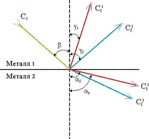 Во вторую среду проходят также две волны. Продольная – с углом, отличным от угла падения, и сдвиговая, угол которой также отличается от угла отражения сдвиговой волны в первом твердом теле. Углы падения, отражения и преломления подчиняются закону Снеллиуса (закон синусов)