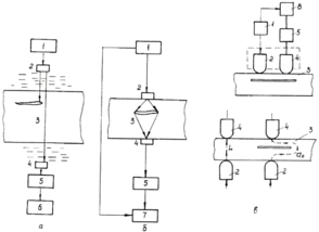 Рис. 6 - Методы прохождения: а - теневой; б - временной теневой; в – велосимметрический: 1 - генератор; 2 - излучатель; 3 - объект контроля; 4 - приёмник; 5 - усилитель; 6 - измеритель амплитуды; 7 - измеритель времени пробега; 8 - измеритель фазы