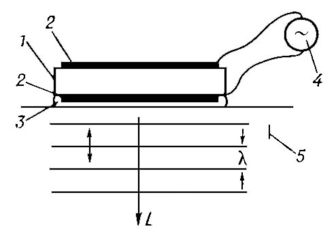 Рис. 5 - Излучение (приём) продольных волн L пластинкой, колеблющейся по толщине в твердое тело: 1 - кварцевая пластинка среза Х толщиной l/2, где l - длина волны в кварце; 2 - металлические электроды; 3 - жидкость (трансформаторное масло) для осуществления акустического контакта; 4 - генератор электрических колебаний; 5 - твёрдое тело