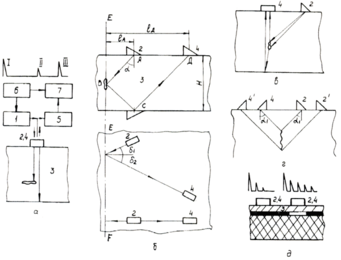 Рис. 7 - Методы отражения: а - эхо; б - эхо-зеркальный; в - дельта-метод; г - дифракционно-временной; д – ревербереционный: 1 - генератор; 2 - излучатель; 3 - объект контроля; 4 - приёмник; 5 - усилитель; 6 - синхронизатор; 7 – индикатор