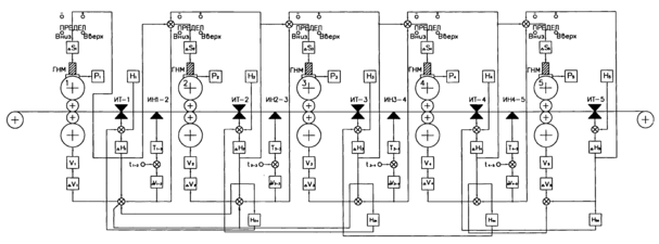 Рисунок 2. - Структурная схема основных воздействий регулирования комплекса САРТ и Н 5-кл. стана "630": ГНМ - гидравлический нажимной механизм; ИТ - измеритель толщины; ИН - измеритель натяжения; Н1, Н2, Н3, Н4, Н5 - уставки толщины; t - уставка натяжения;