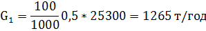 Берем среднее, 50% от общего числа жителей сдают белье в прачечную. При норме 100 кг на одного человека в год количество белья G1, т/год, поступающего от населения, при N=число населения – 25300 чел., составляет