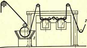 Плитная (желобовая) машина имеет два медных или чугунных желоба 1 (рис.1). При работе машины эти желоба нагреваются до красного каления. Ткань 2 в виде непрерывной ленты, полученной сшиванием нескольких кусков, поступает на раскаленные желоба и проходит по ним со скоростью 2,5—3 м/сек. Чтобы потушить тлеющие волоконца, ткань пропускают через паровой искрогаситель или замачивают в ванне 3.