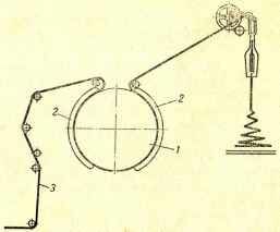 Прессование применяется для уплотнения, выравнивания ткани и придания ей блеска. Прессование производится на цилиндрических прессах (самопрессах), представляющих собой полый цилиндр 1 (рис. 5) с двумя полыми корытами 2, прилегающими к цилиндру. При работе пресса ткань 3 пропускают между нагретыми до 90—100°С цилиндром и корытами. Регулируя зазор между цилиндром и корытами получают на ткани определенный эффект прессования.