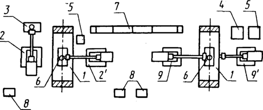 Рис. 5 - Структурная схема ГПЛ холодной штамповки на основе универсальных ПР: I - пресс двухстоечный; 2, У - ПР; 3 - подающее устройство; 4 - тара для штамповки; 5 - тара для высечки; 6 - штамп; 7 - роботизированная транспортная система (РТА); 8 - СПУ ПР- 99'-ПР.