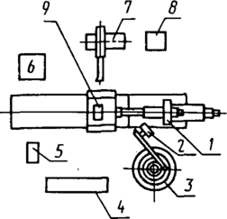 Рис. 2 - ГПМ литья под давлением: 1 - МЛД; 2 - ПР для заливки металла; 3 - печь раздаточная; 4 - система управления; 5 - стенд контроля технологических параметров; 6 - установка термостатирования; 7 - ПР для съема отливок; 8 - приемно-выдающее устройство (тара для отливок); 9 - устройство смазки