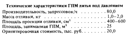 Особенности и основные факторы, определяющие типовую компоновку ГПМ литья под давлением (и его возможные модификации) обусловливаются серийностью и номенклатурой отливок, технологическим циклом и параметрами получения отливок на машинах литья под давлением (МЛД), видов применяемых ПР для заливки металла, смазки пресс-форм и пресс-камер, способов снятия отливок после литья и обрубки. В зависимости от состава и принятых решений по разгрузке МЛД типовые ГПМ литья под давлением подразделяются на следующие исполнения: с применением горизонтальных или вертикальных прессов; со сбросом отливок в тару или на транспортер; с транспортерами-съемщиками, снабженными заливочными стержнями. Например, для автоматизации процесса изготовления отливок из цветных металлов и сплавов типовым ГПМ литья под давлением является модель 2 Л.