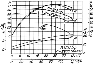 =45,56 м. Зная марку насоса К 90-55 выбираются графические характеристики центробежного насоса (рисунок 2.1). Используя значения