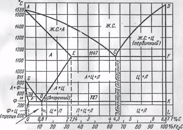 На правой ординате отложена температура плавления Fe3C, соответствующая 1550° (точка D на диаграмме).