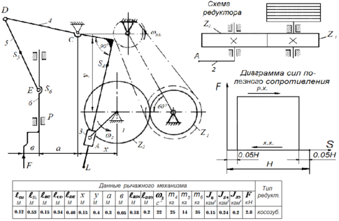 Долбежный станок предназначен для долбления пазов и внутренних канавок в отверстиях. Для движения ползуна с резцом используется шестизвенный кривошипно-кулисный механизм OALBCDEP с качающейся кулисой. Кривошип 2 получает вращательное движение от электродвигателя через клинно-ременную передачу и горизонтальный одноступенчатый редуктор с цилиндрическими колесами. Вращательное движение кривошипа преобразуется в возвратно-поступательное движение ползуна 6 через качающуюся вокруг опоры С кулису 4 с камнем 3 и шатун 5. Ход ползуна Н выбирается в зависимости от длины обрабатываемой поверхности детали с учетом перебегов 0.05Н в начале и конце рабочего хода (см. диаграмму сил полезного сопротивления). Рабочий ход ползуна 6 совершается за больший промежуток времени, чем холостой ход, и соответствует большему углу поворота кривошипа.