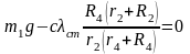 Груз 1 один подвешен на нити к центру невесомого блока 2. Меньшая ступень блока 2 прикреплена нитью к горизонтальной поверхности, а нить, намотанная на большую ступень – навита на закрепленный в центре блок 3. Далее нить с блока 3 наматывается на меньшую ступень катка 4, который катится по шероховатой горизонтальной поверхности, касаясь ее большей ступенью. Центр катка связан с пружиной, другой конец которой закреплен неподвижно. Нити и пружина, которые являются невесомыми, параллельны соответствующим плоскостям. Нити являются нерастяжимыми и абсолютно гибкими. Сопротивление, возникающее в подшипниках блока, пропорционально первой степени угловой скорости блока: