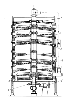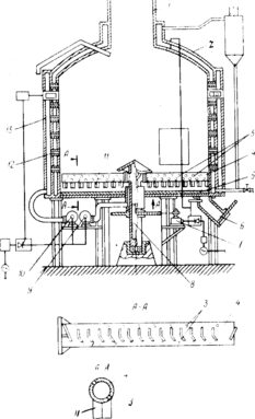 Многоподовые печи (рис. 1) получили широкое распространение в странах Западной Европы и США для сжигания отходов, в первую очередь, осадков городских сточных вод. Печь состоит из цилиндрического стального корпуса 1, футерованного огнеупором, с поэтажно расположенными подами 2. По оси печи располагается охлаждаемый воздухом полый вал 3 с гребковыми лопастями 4. Вал приводится во вращение от расположенного внизу электропривода 5 и передаточного механизма 6. Гребковые лопасти, так же как и вал, выполняются пустотелыми. Через них в процессе работы подается воздух для охлаждения металлических поверхностей. Влажный продукт перемещается гребковыми лопастями сверху вниз от пода к поду навстречу дымовым газам. За счет тепла идущих в противотоке дымовых газов происходит подсушивание отходов, а затем их воспламенение, для чего дополнительно используют горючий газ. Зола, выходящая из патрубка 8, обычно гасится водой, которая затем направляется в отвал.