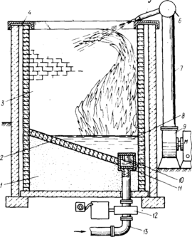 Рис. 3. Американская установка надслоевого горения: 1 - песчаное основание; 2 - днище камеры сгорания; 3 - камера сгорания; 4 - воздушный зазор; 5 - сопло; 6 - коллектор; 7 - напорный воздуховод; 8 - слой жидких отходов; 9 - вентилятор; 10 - отверстия, клапанной коробки; 11 - клапанная коробка; 12 - насос; 13 - трубопровод
