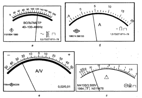 Рис. 1. Лицевые панели приборов: а) вольтметра класса точности 0,5; б) амперметра класса точности 1,5; в) амперметра класса точности 0,02/0,01; г) мегомметра класса точности (