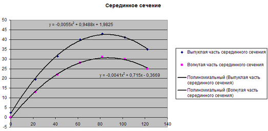 В результате решения получаем ao = 2,1378 , a1 = 1,3828, a2 = -0,0118 для выпуклой части и ao = -0,1908 , a1 = 0,7897 , a2 = -0,0071 – для вогнутой.