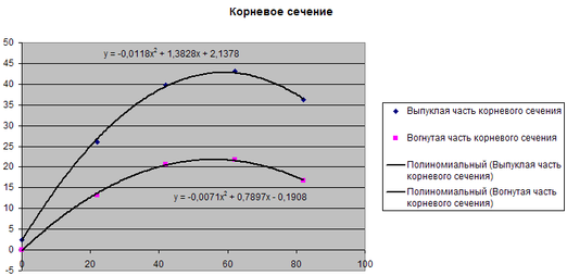 | x | Выпуклая часть корневого сечения | Вогнутая часть корневого сечения |