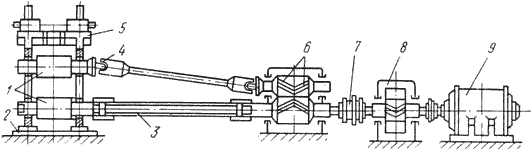Рис. 5 - Схема главной линии прокатного стана: 1 – прокатные валки; 2 – плита; 3 – трефовый шпиндель; 4 – универсальный шпиндель; 5 – рабочая клеть; 6 – шестеренная клеть; 7 – муфта; 8 – редуктор; 9 – двигатель