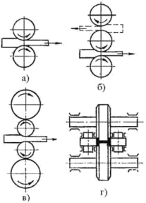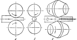 Рис. 3 - Схемы основных видов прокатки: а – продольная; б – поперечная; в – поперечно – винтовая