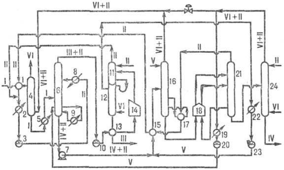 Установка селективного очищення олійної сировини фенолом: 1, 2, 5, 8, 9, 13, 15, 17, 19, 22- теплообмінників; 3- ємкості для фенолу; 4- абсорбера; 6- екстрактора; 7- насоса для відкачування екстракту; 10- ємкості для рафінад; 11, 12 і 16, 21, 2.4- колон для регенерації фенолу відповідно з рафінаду і екстракту; 14, 18- трубчасті печі; 20, 23- ємкостей для фенолової води; I- сировина; II- фенол; III- рафінад; IV- екстракт; V- фенолова вода; VI- водяна пара.