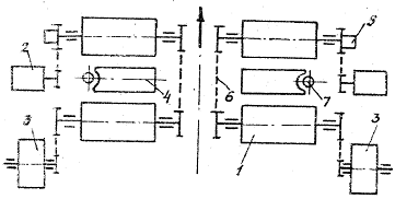 1 – ролик; 2 – электродвигатель; 3 – инерционная масса; 4 – подъёмник; 5 – датчик пути и скорости; 6 – цепная передача; 7 – колёсоотбойный ролик.