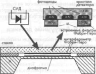 При измерении низких давлений или когда для повышения динамического диапазона применяются толстые мембраны, для получения заданных значений разрешения и точности величина перемещения диафрагмы может оказаться недостаточной. В дополнение к этому рабочие характеристики большинства пьезорезистивных и некоторых емкостных датчиков довольно сильно зависят от температуры, что требует использования дополнительных цепей температурной компенсации. Оптические методы измерений обладают рядом преимуществ над остальными способами детектирования давления: простотой, низкой температурной чувствительностью, высокой разрешающей способностью и высокой точностью. Особенно перспективными являются оптоэлектронные датчики, реализованные на основе явления интерференции света. Такие преобразователи используют принцип измерения малых перемещений Фабри-Перо. На рис. 6 показана упрощенная схема одного из таких датчиков.