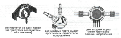 Датчики давления бывают трех типов, позволяющих измерять абсолютное, дифференциальное и манометрическое давление. Абсолютное давление, например, барометрическое, измеряется относительно давления в эталонной вакуумной камере, которая может быть как встроенной (рис. 1А), так и внешней. Дифференциальное давление, например, перепад давления в дифференциальных расходомерах, измеряется при одновременной подаче давления с двух сторон диафрагмы. Манометрическое давление измеряется относительно некоторого эталонного значения. Примером может служить, измерение кровяного давления, которое проводится относительно атмосферного давления. Манометрическое давление по своей сути является разновидностью дифференциального давления. Во всех трех типах датчиков используются одинаковые конструкции диафрагм и тензодатчиков, но все они имеют разные корпуса. Например, при изготовлении дифференциального или манометрического датчика, кремниевый кристалл располагается внутри камеры, в которой формируются два отверстия с двух сторон кристалла (рис. 1Б). Для защиты устройства от вредного влияния окружающей среды внутренняя часть корпуса заполняется силиконовым гелем, который изолирует поверхность кристалла и места соединений, но позволяет давлению воздействовать на диафрагму. Корпуса дифференциальных датчиков могут иметь разную форму (рис. 2). В некоторых случаях при работе с горячей водой, коррозионными жидкостями и т.д. необходимо обеспечивать физическую изоляцию устройства и гидравлическую связь с корпусом датчика. Это может быть реализовано при помощи дополнительных диафрагм и сильфонов. Для того чтобы не ухудшались частотные характеристики системы, воздушная полость датчика почти всегда заполняется силиконовой смазкой типа Dow Corning DS200.