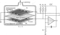 На рис. 7 показан дифференциальный вакууметр Пирани. Камера датчика разделена на две идентичные секции. В одной из секций газ находится при эталонном давлении (например, при 1 атм =760 торр), а вторая расположена в вакуумной камере, давление в которой необходимо измерить. В каждой камере есть нагреваемая пластина, которая для уменьшения кондуктивной теплопередачи через окружающие твердые предметы подвешена на очень тонких соединительных элементах. Желательно, чтобы обе камеры имели одинаковые форму, конструкцию и размеры, для того чтобы кондуктивные и радиационные потери тепла в них были идентичными. Чем симметричнее конструкция камер, тем лучше компенсируются паразитные теплопотери. Пластины нагреваются при помощи электрических нагревателей. В рассматриваемом датчике нагревательным элементом является термистор с отрицательным температурным коэффициентом (ОТК). Сопротивления термисторов равны и имеют сравнительно низкий номинал, поэтому в них возможно протекание процесса саморазогрева Джоуля.