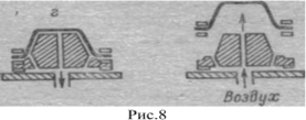 Внутрь матрицы 1также подают сжатый воздух, при этом лист как бы зависает над матрицей, так как образуется воздушная подушка, в то же время он не касается толкателя. Вытяжка происходит между двумя воздушными подушками равномерно по всей поверхности заготовки. После опускания толкателя заготовка прижимается к матрице, в ней создается вакуум и происходит окончательное формование изделия.
